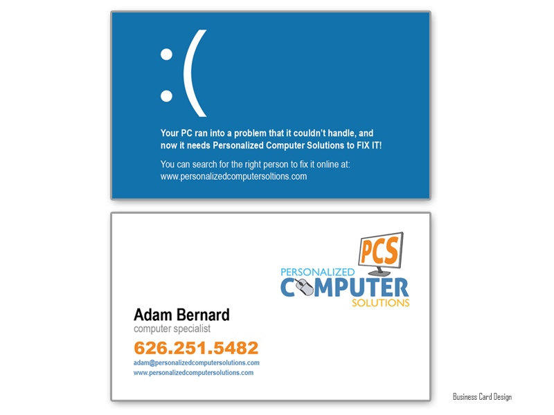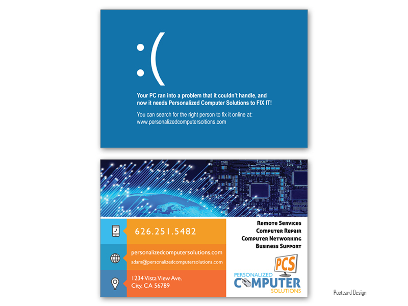 Personalized Computer Solutions is one of my oldest customers. When I saw the state of their logo and website design I had to step up and help them out. So I gave them a complete make over, from color scheme to design. Since they are a computer repair and business networking. I knew they would love the “all hated Blue Screen of Death” for their new add campaign. As it represents what they are called to fix for companies everyday big or small. Below are the samples I created for Personalize Computer Solutions.